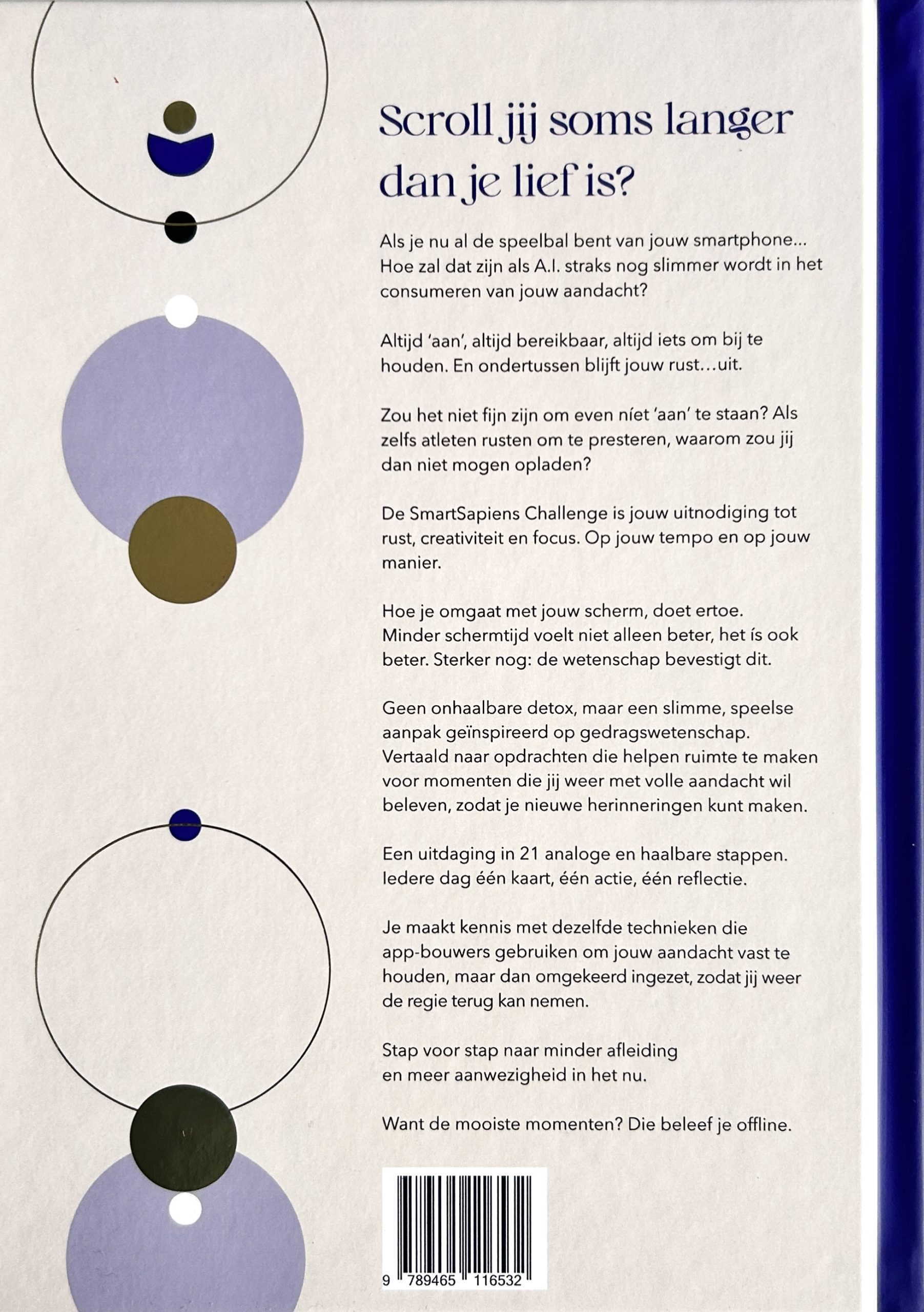De SmartSapiens Challenge begeleidt je in 21 stappen naar gezonder en bewuster smartphonegebruik. Geen apps, geen meldingen, geen digitale tracking – maar tastbare tools die je écht helpen je gewoontes te veranderen. Met een speelse, motiverende en psychologisch onderbouwde aanpak breng je focus, rust en regie terug in je dagelijks leven.